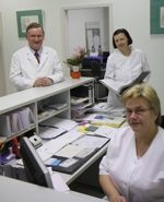 Frau Monika Anderssohn, Facharbeiterin für Datenverarbeitung, empfängt Patienten an der Rezeption